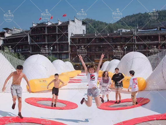水上魔毯特征:水上魔毯項(xiàng)目建設(shè)在寬闊的水面上,采用充氣軟床、蹦床、繩網(wǎng)等柔性材料搭建一座有趣的軟橋。水上魔毯項(xiàng)目可以讓游客在橋面上彈跳、奔跑、翻滾等作出自由的動(dòng)作。水上魔毯是景區(qū)、營(yíng)地中新型的游樂(lè)項(xiàng)目