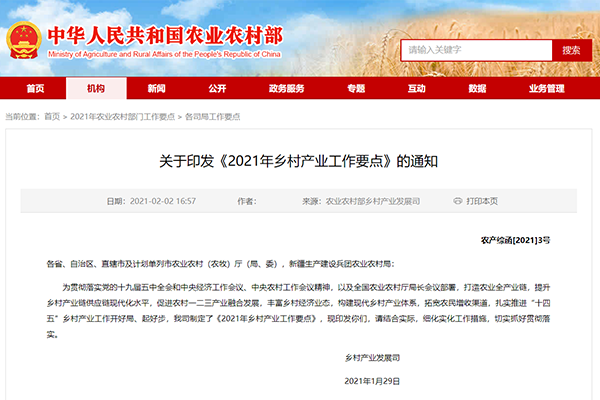 關(guān)于印發(fā)《2021年鄉(xiāng)村產(chǎn)業(yè)工作要點(diǎn)》的通知